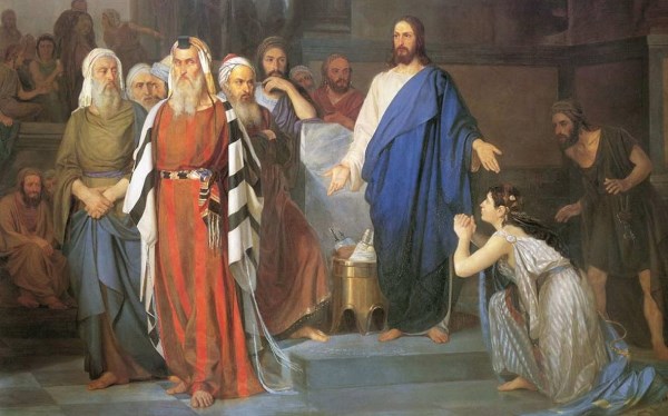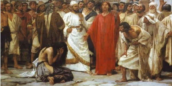 János 8.3. Az írástudók és a farizeusok pedig egy asszonyt vivének hozzá, a kit házasságtörésen kaptak vala, és a középre állítván azt,  4. Mondának néki: Mester, ez az asszony tetten kapatott, mint házasságtörő.  5. A törvényben pedig megparancsolta nékünk Mózes, hogy az ilyenek köveztessenek meg: te azért mit mondasz? 7. De mikor szorgalmazva kérdezék őt, felegyenesedve monda nékik: A ki közületek nem bűnös, az vesse rá először a követ.