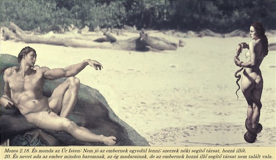 I. Mózes 2.22. És alkotá az Úr Isten azt az oldalbordát, a melyet kivett vala az emberből, asszonnyá, és vivé az emberhez. 23. És monda az ember: Ez már csontomból való csont, és testemből való test: ez asszonyembernek neveztessék, 25. Valának pedig mindketten mezítelenek, az ember és az ő felesége, és nem szégyenlik vala.